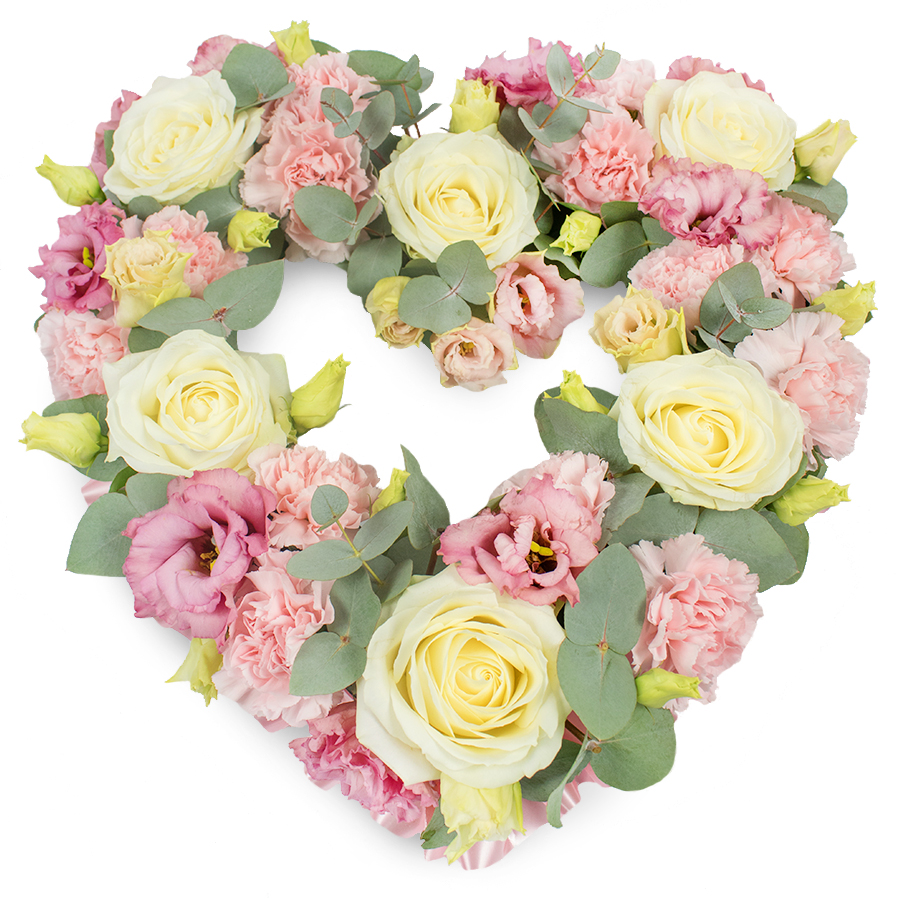 Honor your loved ones with our open heart tribute bouquet, artfully composed of exquisite white roses, tender pink carnations, sophisticated pink lisianthus, and aromatic eucalyptus leaves. Each stem is hand-selected to ensure maximum freshness and beauty.