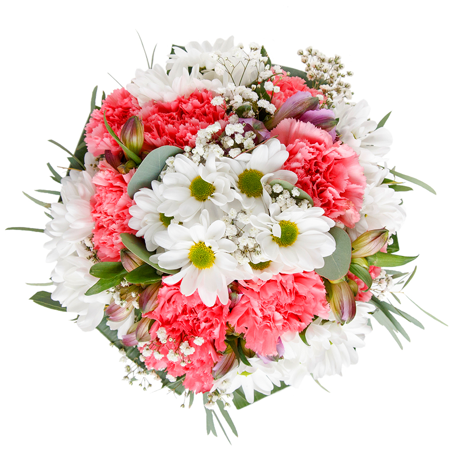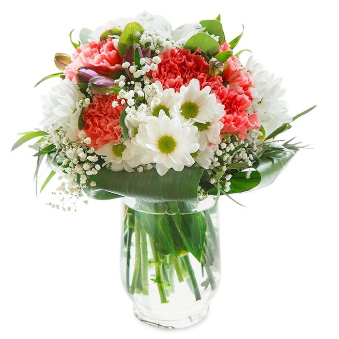 Delight your loved ones with our beautiful white and pink mixed flower bouquet. This exquisite arrangement combines a serene palette of snow-white chrysanthemums, airy gypsophila, charming light pink carnations, and rich aspidistra leaves, all thoughtfully curated to create a stunning and unique display.